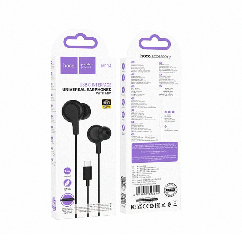 Hoco M114 Type-C Jia Universal Digital Earphones with Microphone – 1.2M, Black